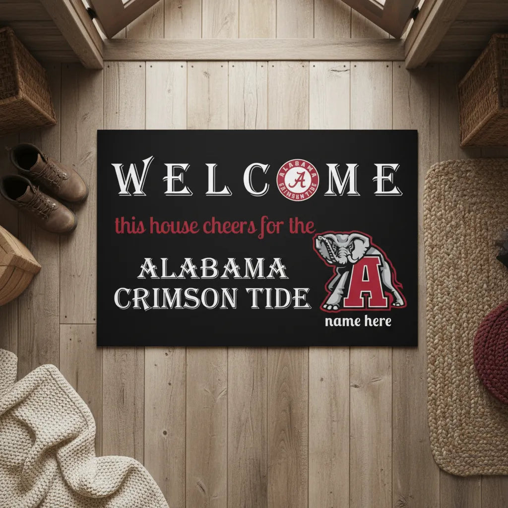 This custom “Welcome – This House Cheers For the Alabama Crimson Tide” mat is made for true fans who live and breathe Roll Tide.