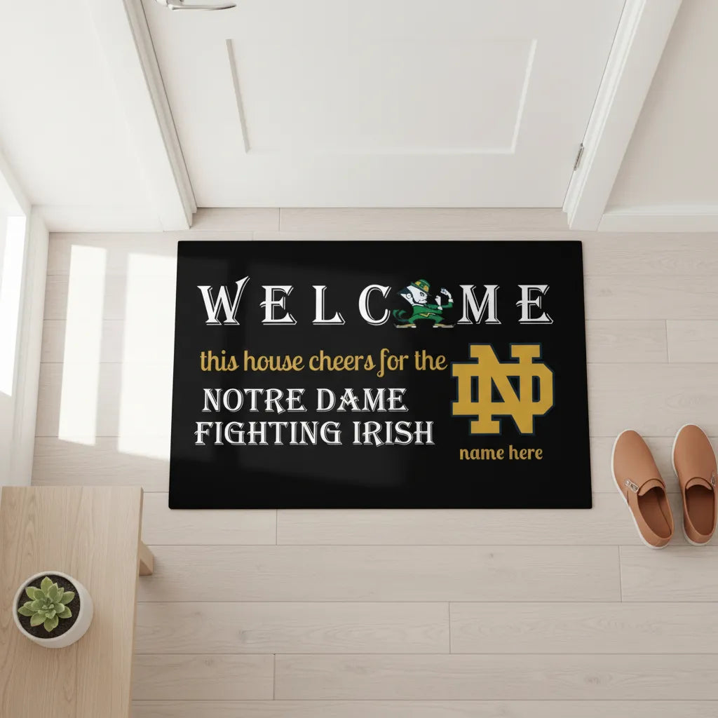 This custom “Welcome – This House Cheers For the Fighting Irish” mat is made for fans who bleed blue and gold. 💙💛