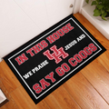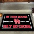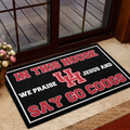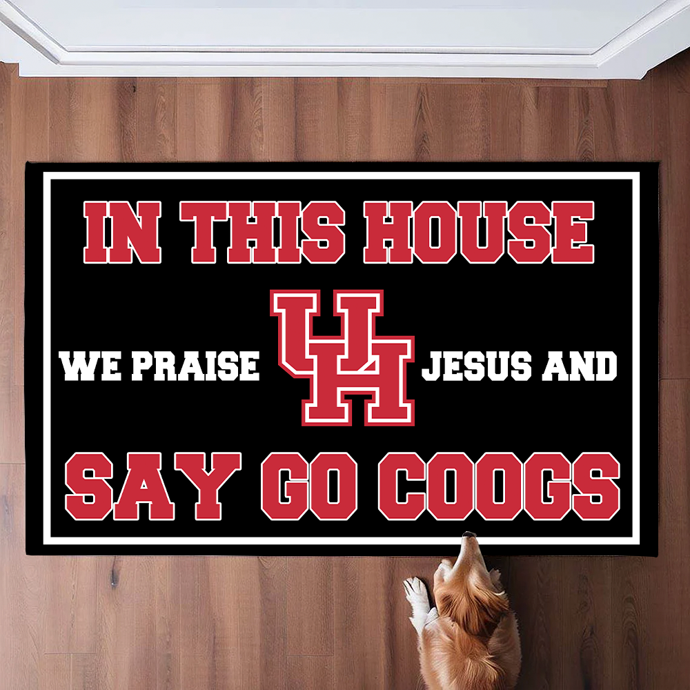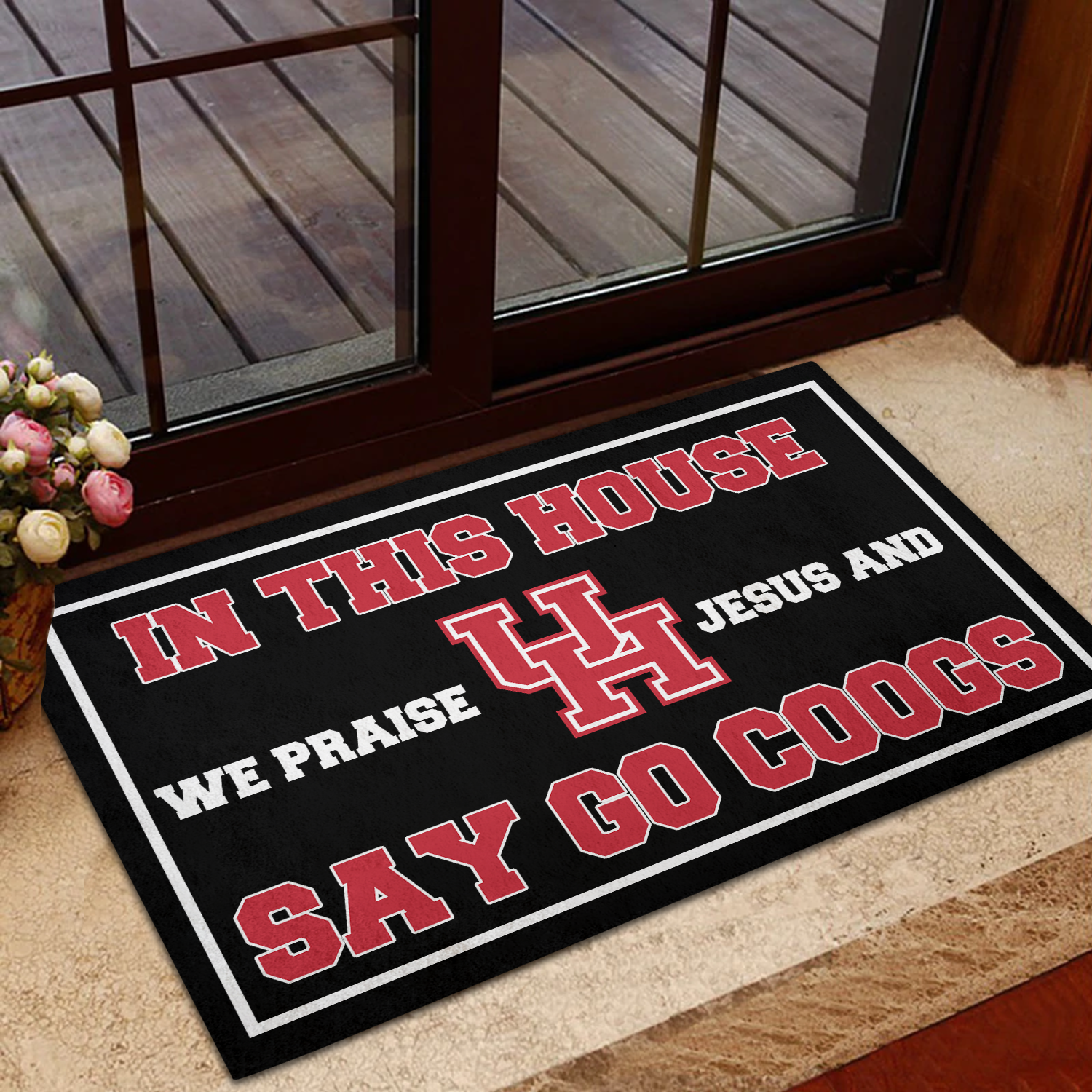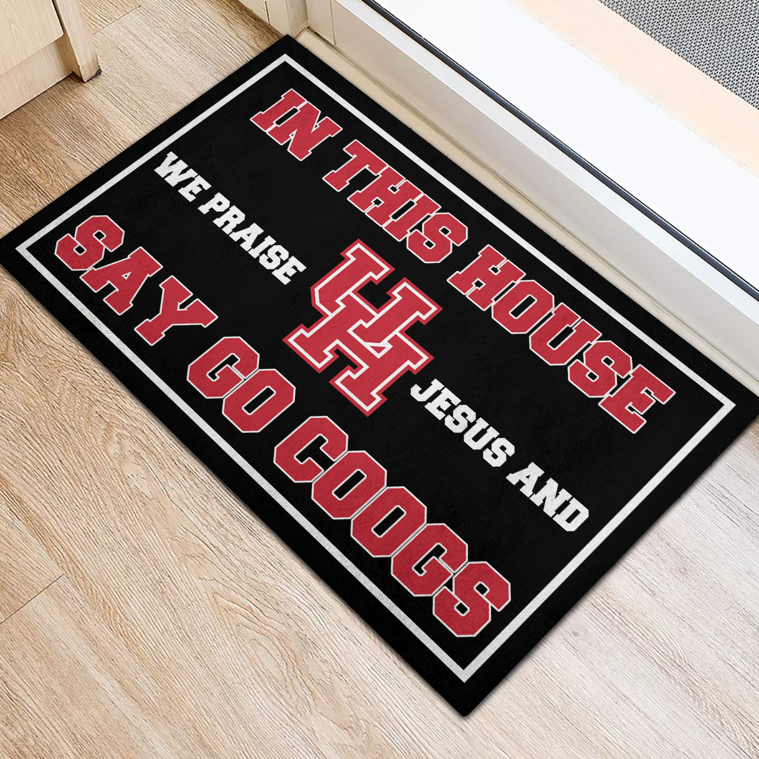 In This House We Praise Jesus and Say Go Coogs Doormat for Houston Cougars Fans