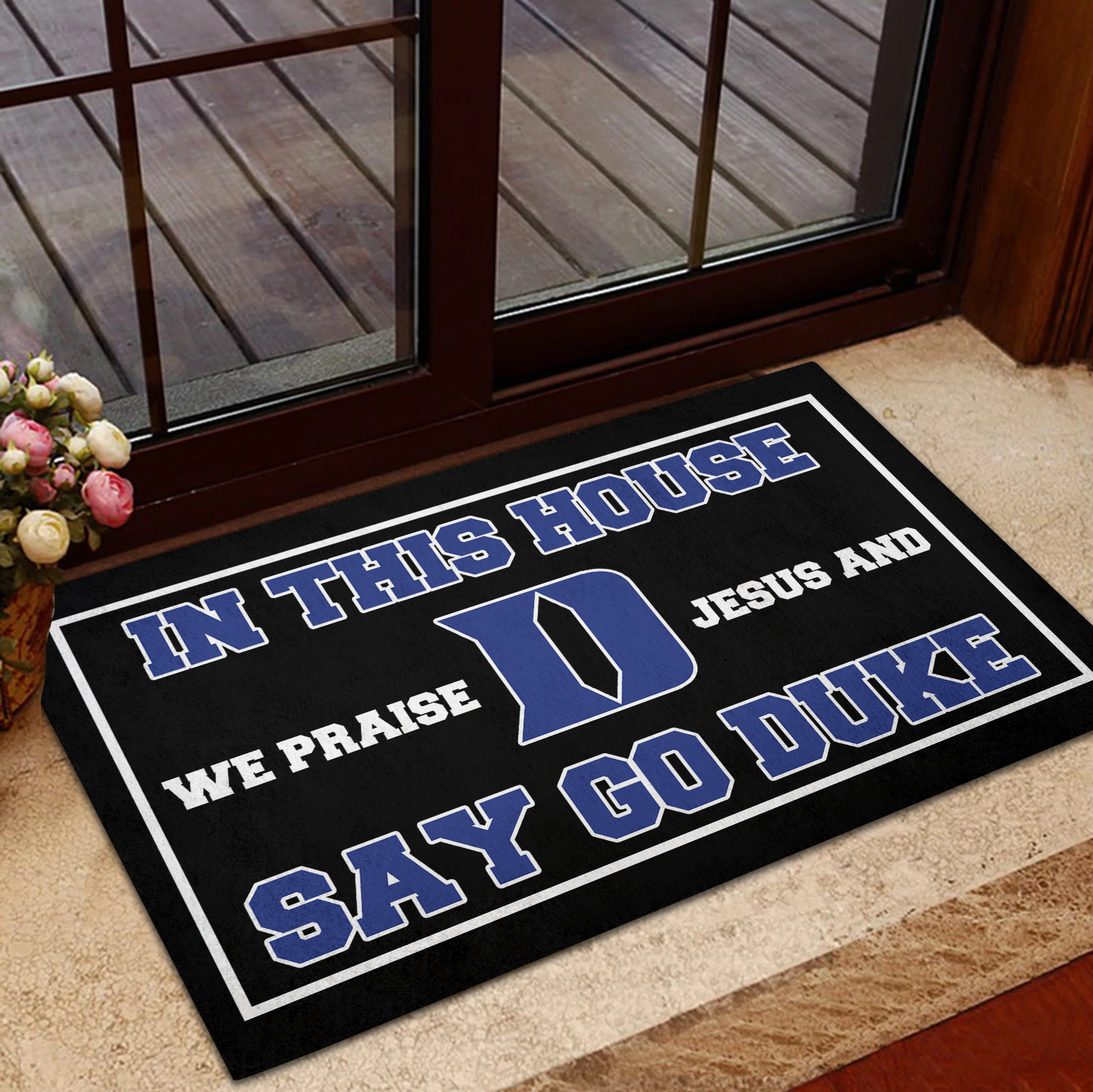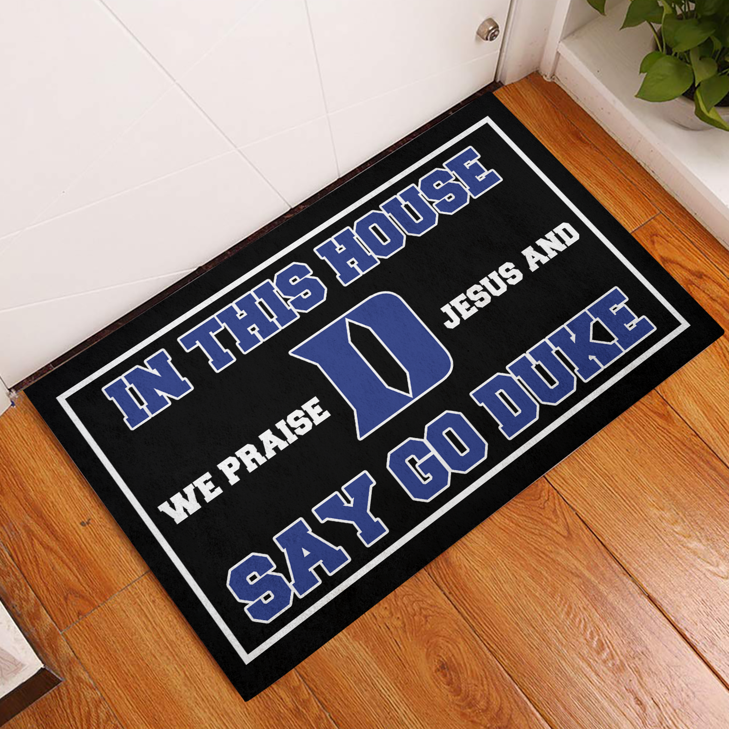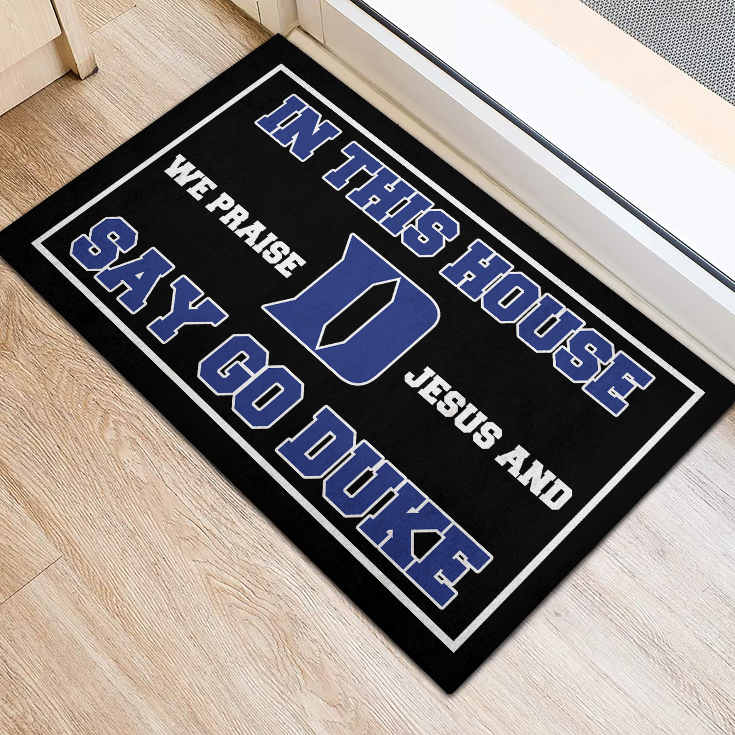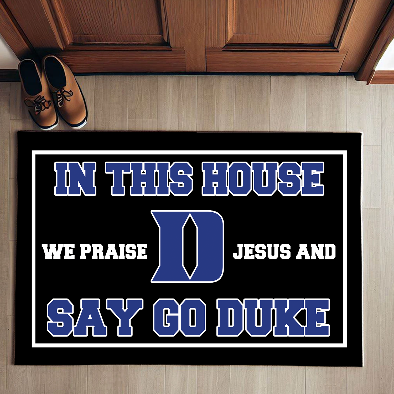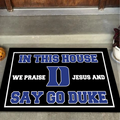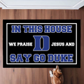 In This House We Praise Jesus and Say Go Duke Doormat for Blue Devils Fans