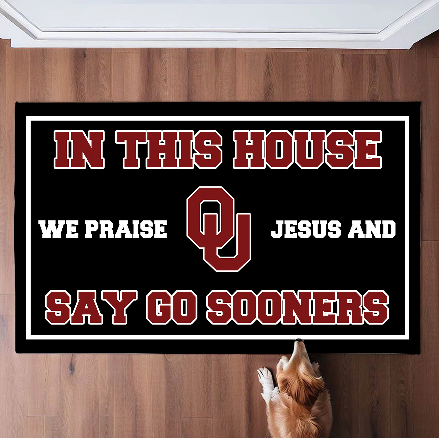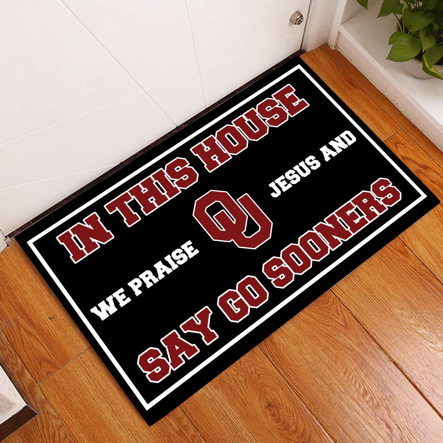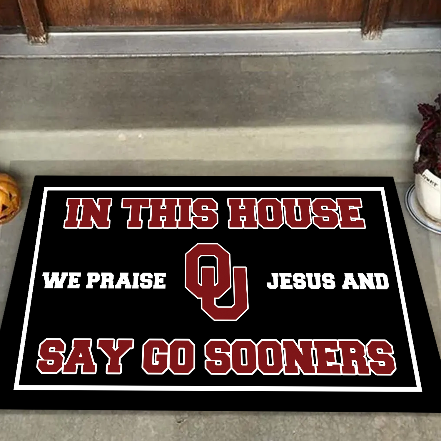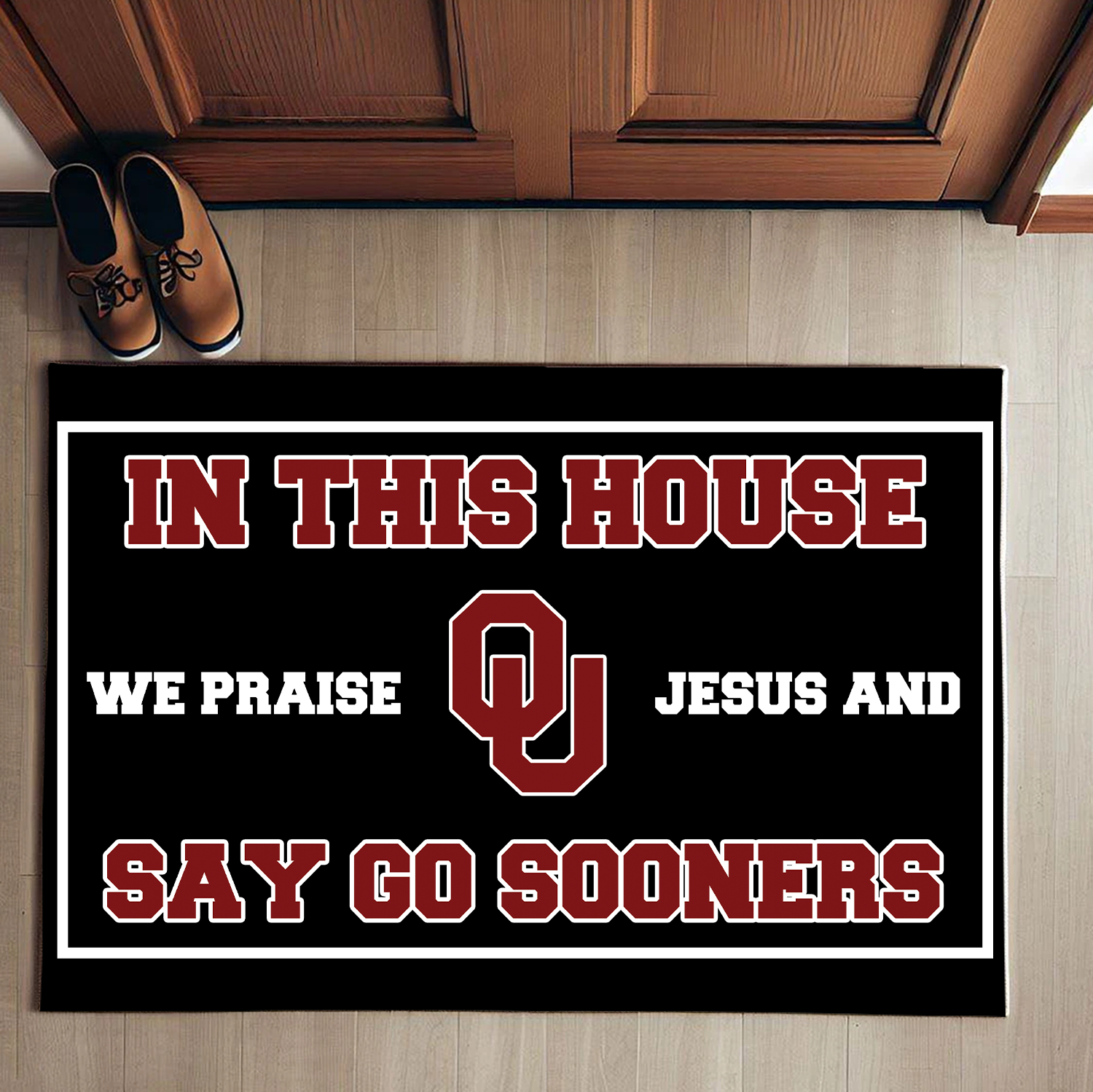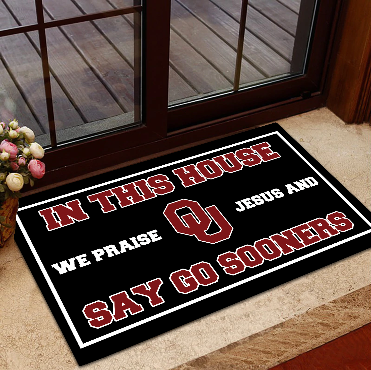 In This House We Praise Jesus and Say Go Sooners Doormat