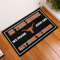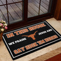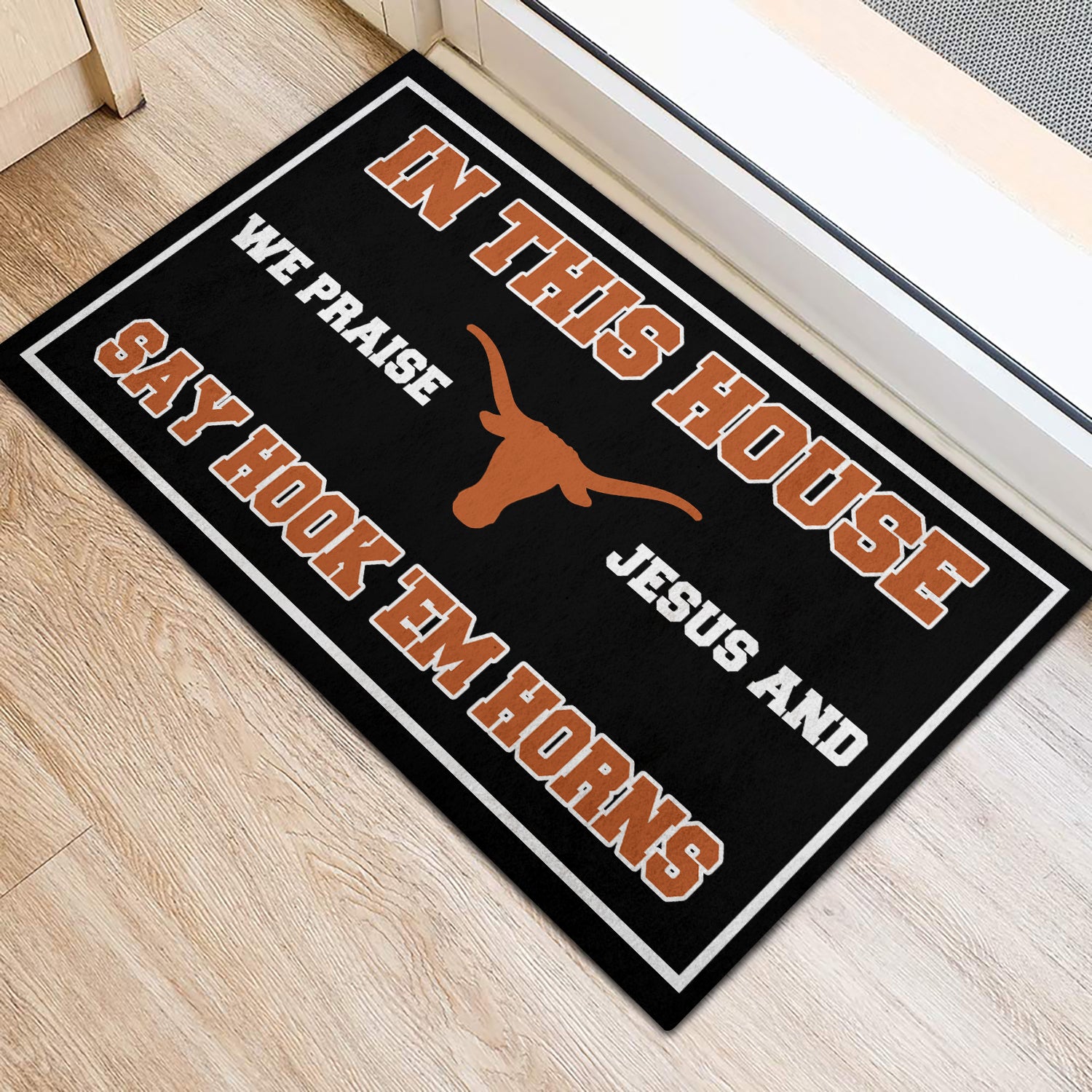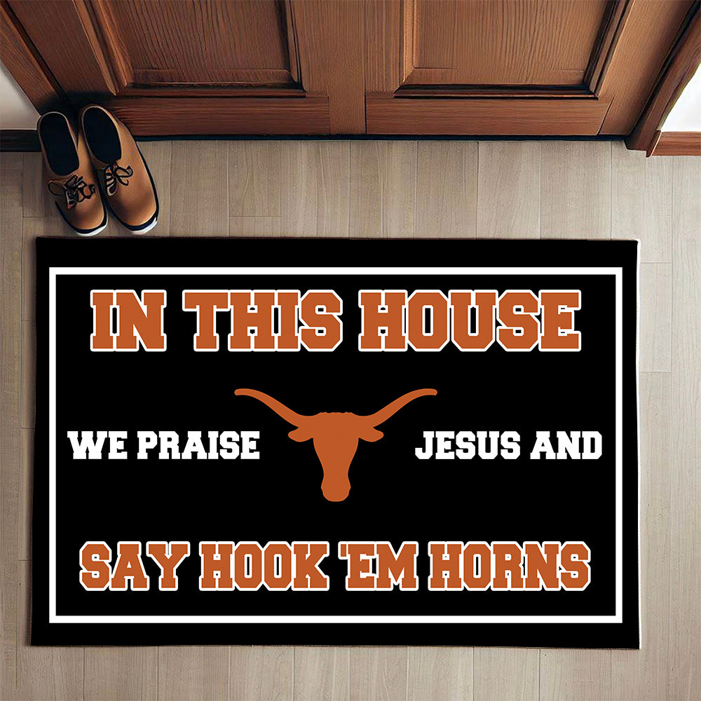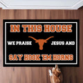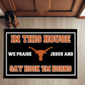 In This House We Praise Jesus and Say Hook 'Em Horns Doormat